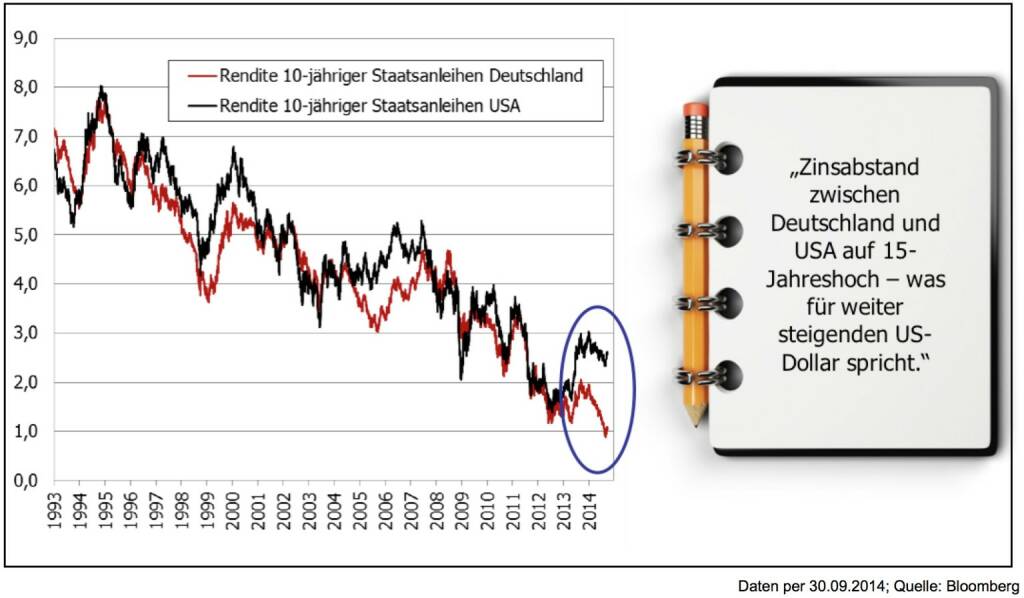 Es gibt Börsenphasen, in denen der Durchblick schwieriger wird. Im abgelaufenen September ist der Blick allerdings klarer geworden. Vor vier Wochen haben wir an dieser Stelle darauf hingewiesen, dass die USA auf Kurs sind, der US-Dollar steigen dürfte und eine Rendite für deutsche Bundesanleihen von unter 1 % wohl eine schwache Konjunktur im EURO-Raum signalisiert. Die vergangenen Wochen brachten eine Bestätigung in Form eines beachtlich starken Dollars und deutlich gekürzter Konjunkturerwartungen in der EURO-Zone. Diese Schere wird weiter aufgehen. Die Aktivitäten der Notenbanken sind klar kommuniziert, werden aber erst in den kommenden Monaten oder im Laufe von 2015 voll wirksam. Die USA werden eine erste, wenn auch leichte Zinserhöhung vornehmen und zudem noch in diesem Jahr die Anleihekäufe beenden. Angesichts eines Wirtschaftswachstums im 3 %-Bereich ist dies die logische und richtige Strategie. Die EZB wird dagegen eine massive Ausweitung der Bilanzsumme anstreben. Ob dies hilft, die Inflation in die gewünschte Richtung von 2 % zu bringen, wird sich weisen. Wie oft an dieser Stelle beschrieben sind die Notenbanken die wesentlichen Treiber der Märkte – und werden es auch 2015 bleiben. Dies richtig zu antizipieren wird wichtiger sein als die teilweise philosophische Diskussion darüber, ob der Aktienmarkt ein KGV von 15 oder 18 verträgt.