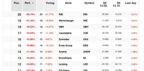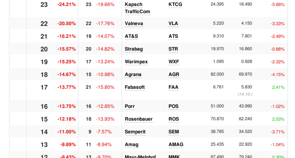 Es rumort und es rumort immer lauter, dass einer der wichtigsten Österreich-Fonds aufgelöst wird und so aktuell scheibchenweise Bestände von immer den gleichen Aktien abgebaut werden. So schonend das am Wiener Markt halt geht. Und das geht nicht schonend. Aber halt mehrmals fünf Prozent statt einmal 20 Prozent. Immer wenn Geld in den Markt kommt, wird weiter abgebaut. Anbei die grossen Verlierer des vergangenen Monats (bei Klick auf "Zur Animation" kommt man zu weiteren Details) Nicht überall gab es schon grosse begleitende Gewinnwarnungen, da werden ziemlich offensichtlich Wetten aufgelöst.