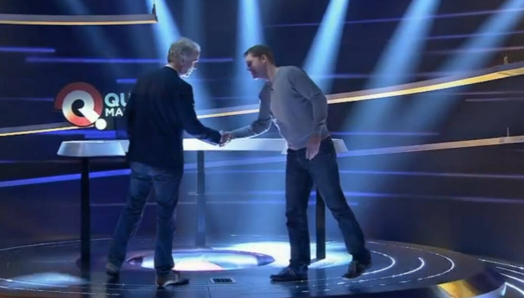 In aller Kürze: Vergangenen Donnerstag war ich bei Servus TV in der Quizmaster-Show zu Gast. Es war eine lässige Sache, auch wenn ich am Finaltisch gegen den Champ Lukas chancenlos war. Da hat der Bessere und Schnellere (eben Lukas) gewonnen. "Danach oben" (auf dem Finaltisch) ist es dabei sogar leichter als "davor unten"(auf dem Vierertisch der Herausforderer), da ist man fast chancenlos gegen gscheite Champs (wie Lukas), die immer Antwort-Vorrecht haben sowie auch gegen schnell drückende Mitspieler, denn nur der Schnellste kommt überhaupt zu Wort. Da braucht man Glück. Und das hatte ich. "Oben" braucht man Wissen und da hatte Lukas mehr davon. Ähnlich schwer wie die Vorrunde ist auch der Spiralweg nach oben, da muss man aufpassen, dass es einen nicht aufhaut.