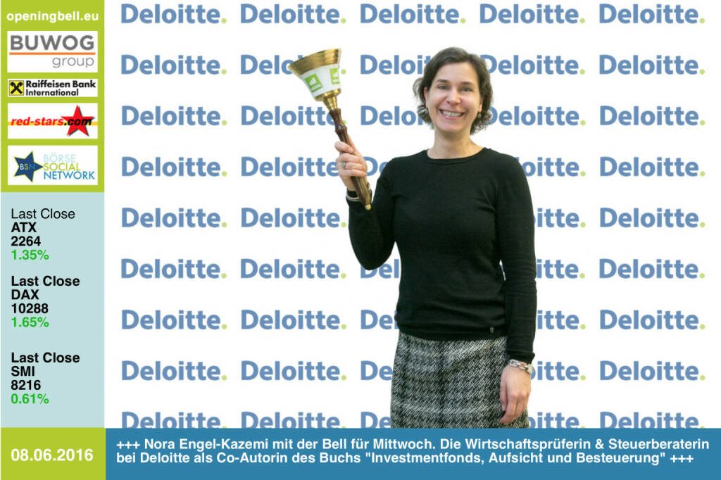 8.6: Nora Engel-Kazemi mit der Opening Bell für Mittwoch. Die Wirtschaftsprüferin und Steuerberaterin bei Deloitte war zuletzt u.a. Co-Autorin des Buchs "Investmentfonds, Aufsicht und Besteuerung", siehe hier http://bit.ly/1VLMrT3 http://www.deloitte.at