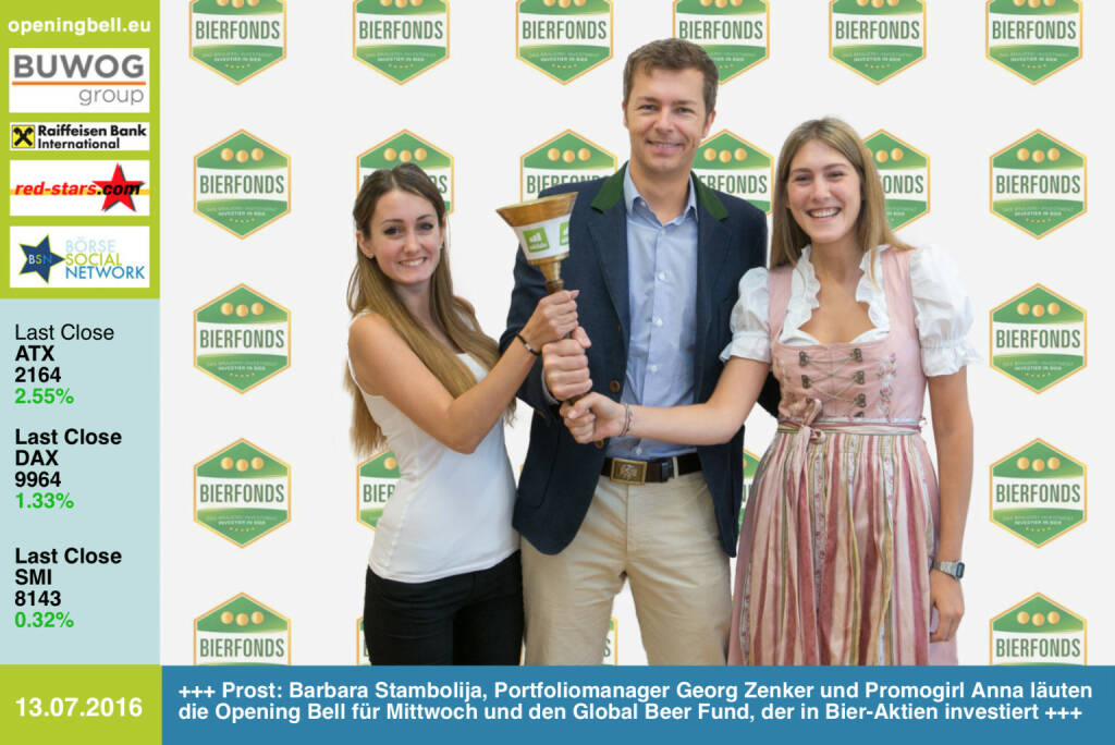 13.7.: Prost: Barbara Stambolija, Portfoliomanager Georg Zenker und Promogirl Anna läuten die Opening Bell für Mittwoch und den Global Beer Fund, der in Bier-Aktien investiert http://www.investier-in-bier.at