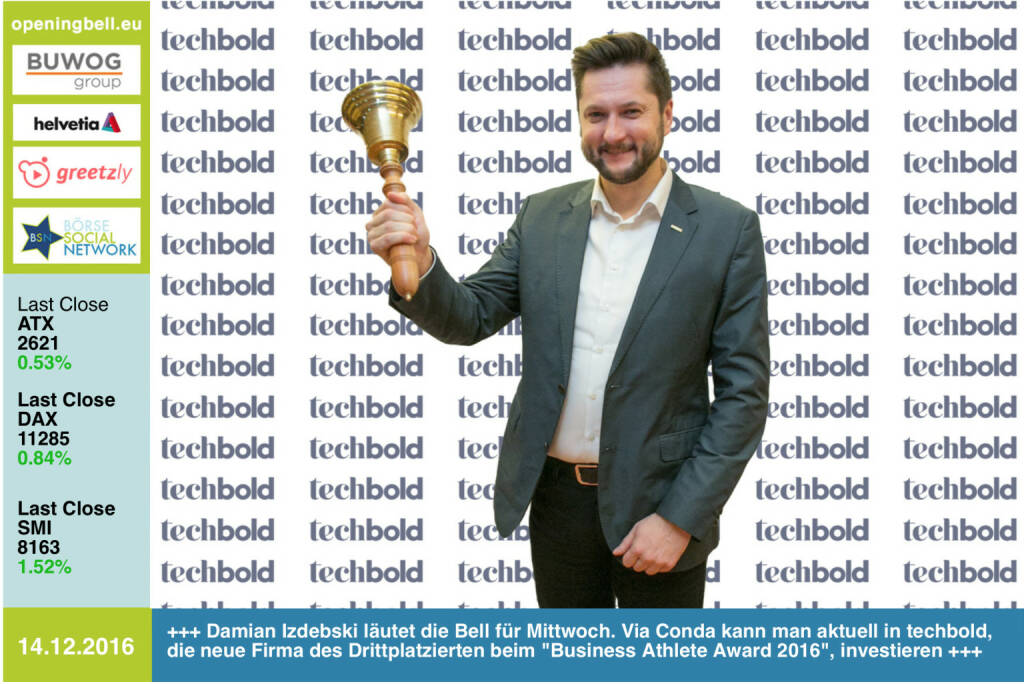 14.12.: Damian Izdebski läutet die Opening Bell für Mittwoch. Via Conda kann man aktuell in techbold, die neue Firma des Drittplatzierten beim "Business Athlete Award 2016", investieren https://www.conda.at/startup/techbold/ https://www.techbold.at http://www.runplugged.com/baa