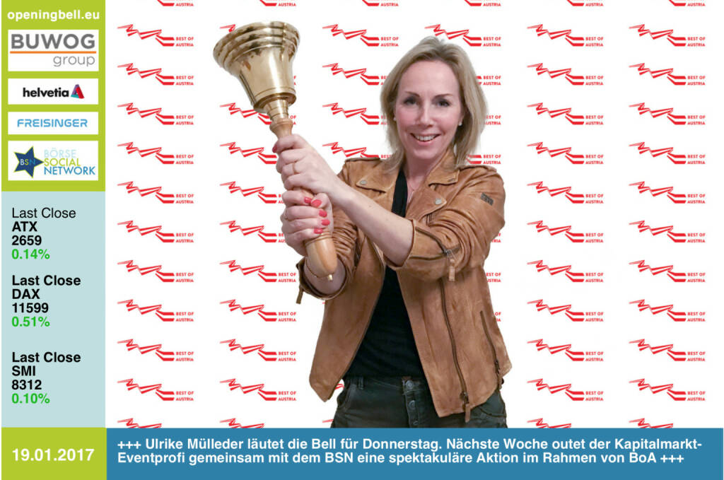 19.1.: Ulrike Mülleder läutet die Opening Bell für Donnerstag. Nächste Woche outet der Kapitalmarkt-Eventprofi gemeinsam mit dem BSN eine spektakuläre Aktion im Rahmen von BoA http://www.bestofaustria.online http://www.boersenradio.at