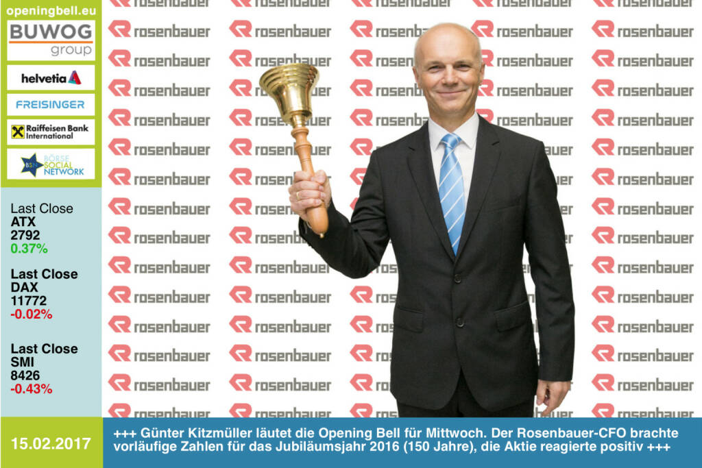 15.2.: Günter Kitzmüller läutet die Opening Bell für Mittwoch. Der Rosenbauer-CFO brachte gestern vorläufige Zahlen für das Jubiläumsjahr 2016 (150 Jahre), die Aktie reagierte positiv http://www.rosenbauer.com https://www.facebook.com/groups/GeldanlageNetwork/