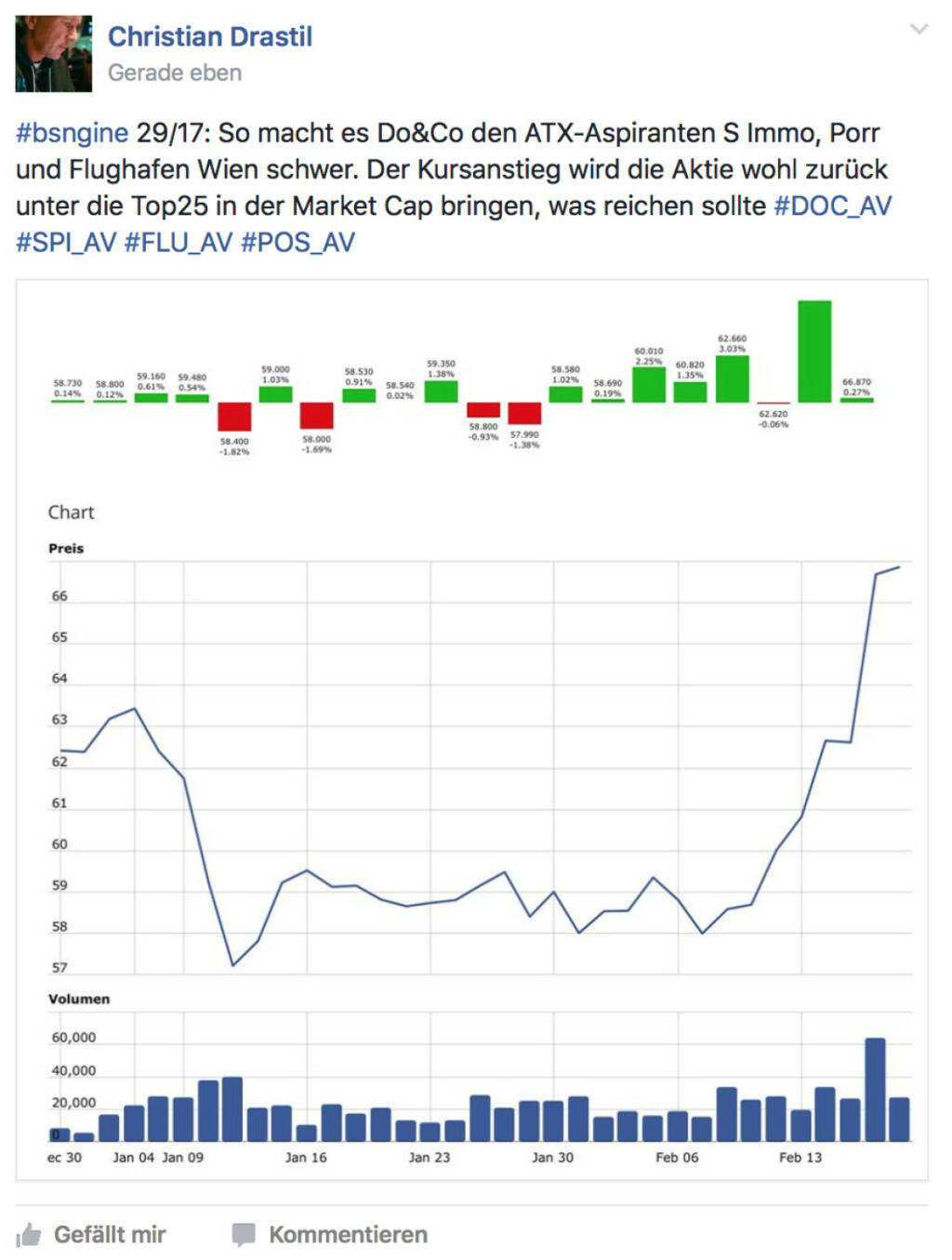 Ich meine: #bsngine 29/17: So macht es Do&Co den ATX-Aspiranten S Immo, Porr und Flughafen Wien schwer. Der Kursanstieg wird die Aktie wohl zurück unter die Top25 in der Market Cap bringen, was reichen sollte #DOC_AV#SPI_AV #FLU_AV #POS_AV