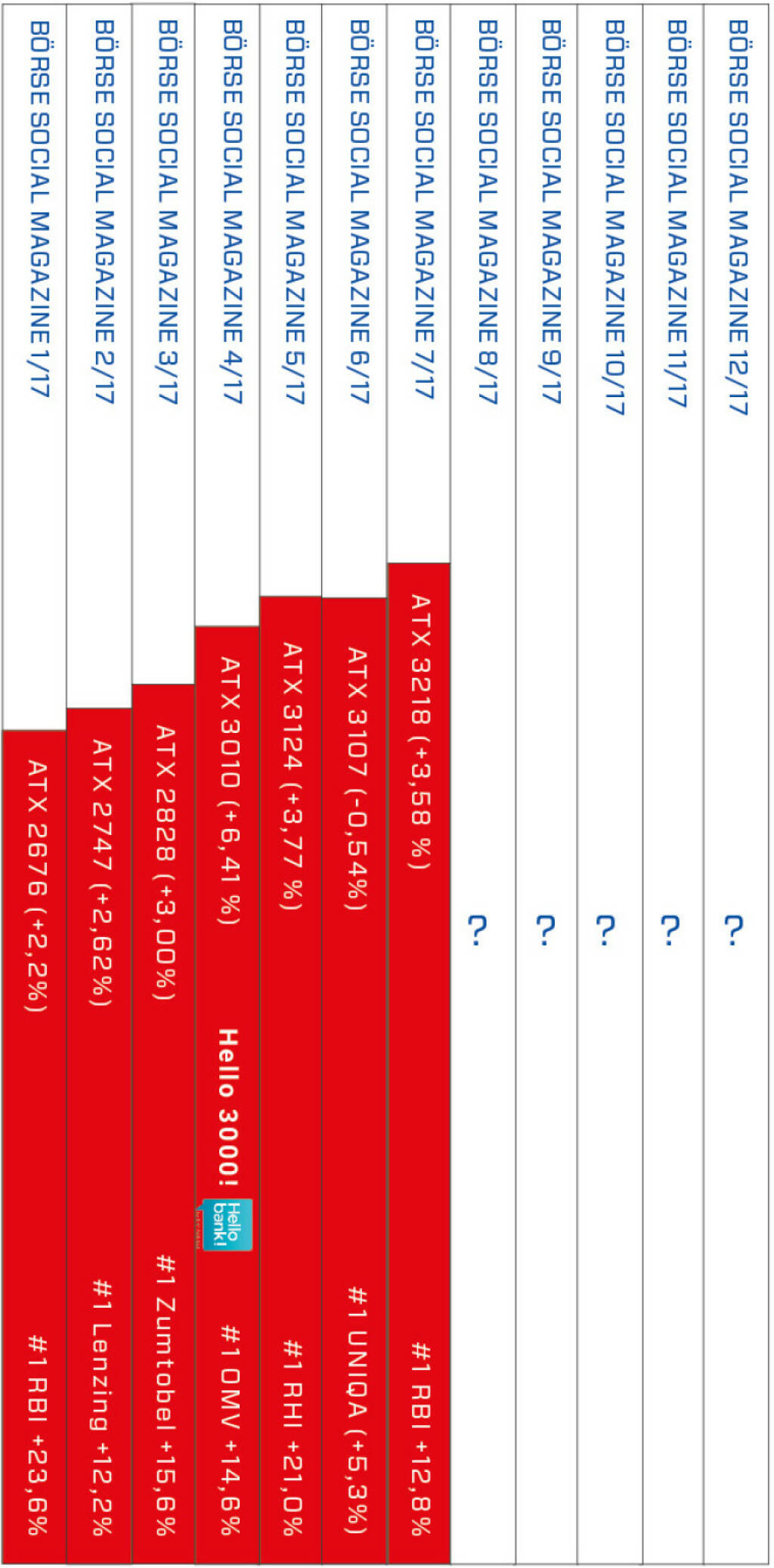 Unser roter Balken am Rücken des Monatstitels Börse Social Magazine wächst, weil der ATX der Wiener Börse steigt, denn der ist die Basis für die Balken. Und die Raiffeisen Bank International AG war nicht nur im Startmonat des 1. Halbjahrs 2017 die beste ATX-Aktie, sondern nun auch im Startmonat des 2. Halbjahrs. http://www.boerse-social.com/magazine .