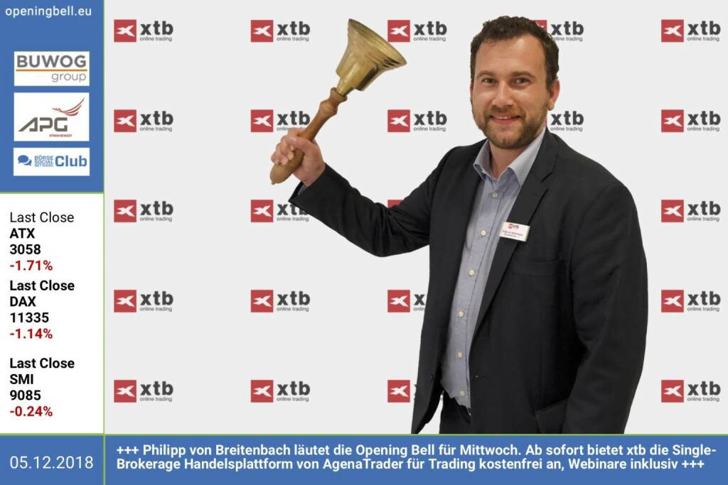 5.12.: Philipp von Breitenbach läutet die Opening Bell für Mittwoch. Ab sofort bietet xtb die Single-Brokerage Handelsplattform von AgenaTrader für Trading kostenfrei an, Webinare inklusiv. https://de.xtb.com/mercury-webinar-workshop https://www.facebook.com/groups/GeldanlageNetwork