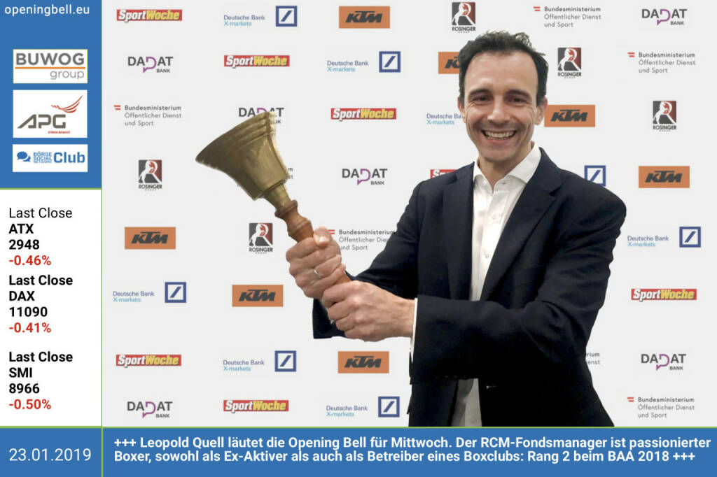 23.1.: Leopold Quell läutet die Opening Bell für Mittwoch. Der RCM-Fondsmanager ist passionierter Boxer, sowohl als Ex-Aktiver als auch als Betreiber eines Boxclubs: Rang 2 beim BAA 2018 https://www.rcm.at https://backyard.wien Es gratulieren die Award-Partner https://www.ktm.com/at/ https://www.dad.at http://www.rosinger-gruppe.de https://www.xmarkets.db.com/DE und https://www.sportministerium.at/de https://www.facebook.com/search/top/?q=sportsblogged Alles zum BAA 2018: http://www.runplugged.com/baa