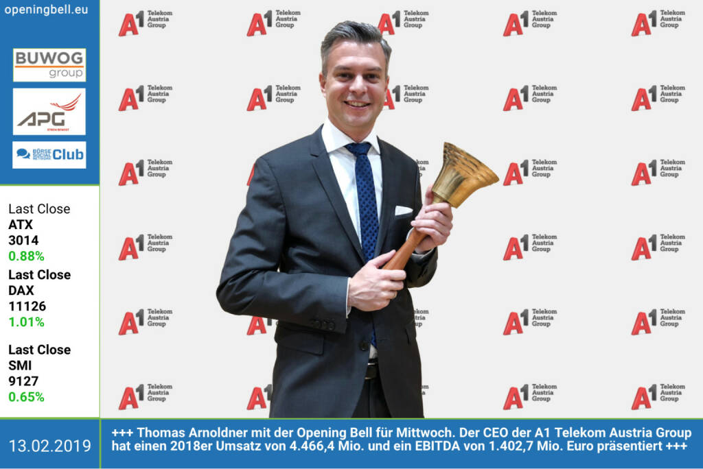 13.2.: Thomas Arnoldner mit der Opening Bell für Mittwoch. Der CEO der A1 Telekom Austria Group hat einen 2018er Umsatz von 4.466,4 Mio. und ein EBITDA von 1.402,7 Mio. Euro präsentiert. https://www.a1.group https://www.facebook.com/groups/GeldanlageNetwork