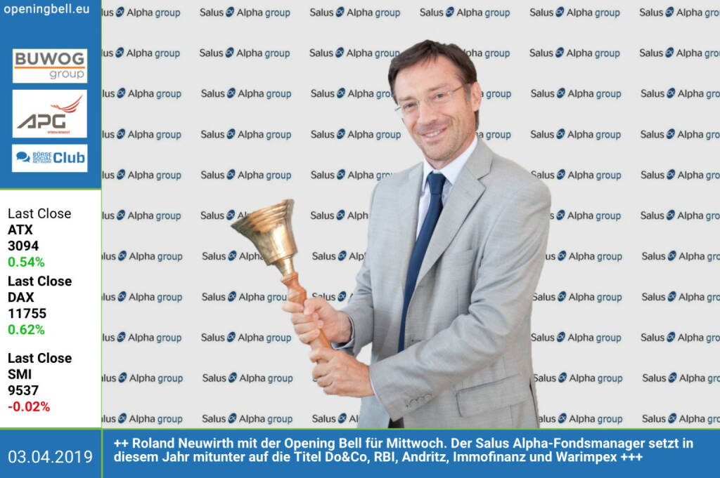 3.4.: Roland Neuwirth mit der Opening Bell für Mittwoch. Der Salus Alpha-Fondsmanager setzt in diesem Jahr mitunter auf die Titel Do&Co, RBI, Andritz, Immofinanz und Warimpex. http://www.salusalpha.com https://www.facebook.com/groups/GeldanlageNetwork