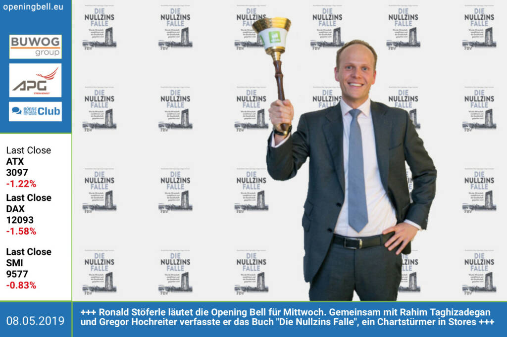 8.5.: Ronald Stöferle läutet die Opening Bell für Mittwoch. Gemeinsam mit Rahim Taghizadegan und Gregor Hochreiter verfasste er das Buch "Die Nullzins Falle", ein Chartstürmer in Stores. Im http://www.boerse-social.com/magazine gibt es ab sofort eine fixe Buch-Seite https://www.facebook.com/groups/GeldanlageNetwork