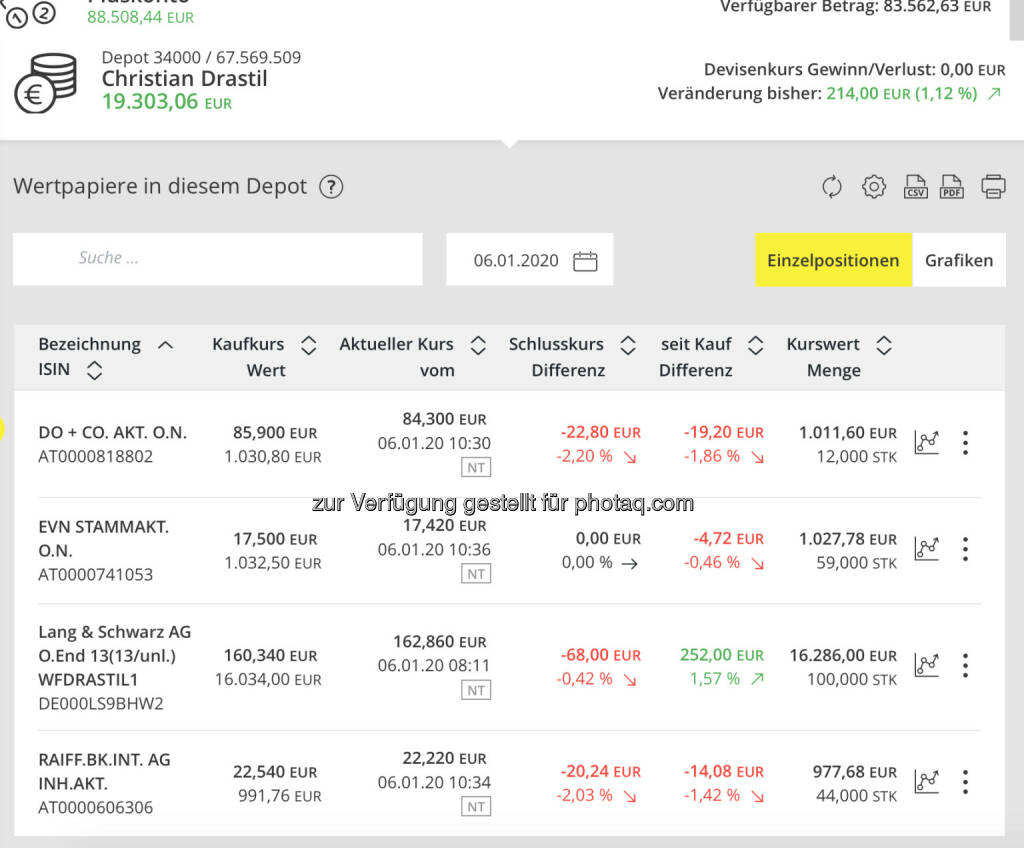Beim Depot bei der http://www.bankdirekt.at habe ich heute folgendes gemacht: "Ich platziere einen Auftrag über 65 Stück von RCB Discount Zert DOC 23.09.2020 (AT0000A26H04), mit einem Betragslimit von 75,850 EUR und einer Gültigkeit bis 06.01.2020, am Handelsplatz WIEN. Der Auftragswert beläuft sich auf 4.945,81 EUR .