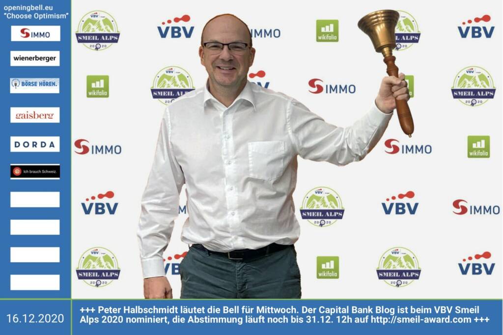 16.12.: Peter Halbschmidt läutet die Bell für Mittwoch. Der Capital Bank Blog https://www.capitalbank.at/de/aktuelles/blog ist beim VBV Smeil Alps 2020 nominiert, die Abstimmung läuft noch bis 31.12. 12h auf http://smeil-award.com http://www.vbv.at - Mehr Choose Optimism: https://boerse-social.com/category/choose_optimism https://www.facebook.com/chooseoptimism