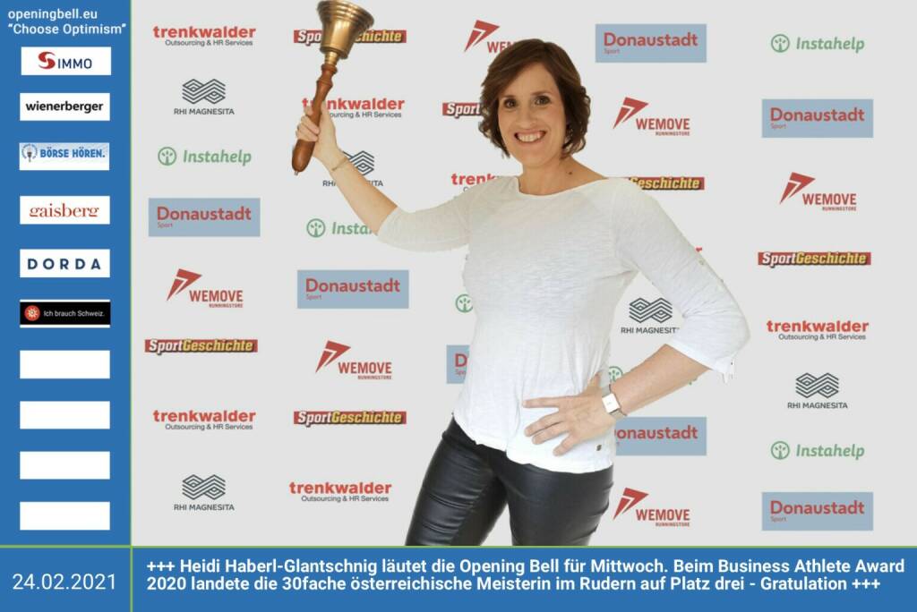 24.2.: Heidi Haberl-Glantschnig läutet die Opening Bell für Mittwoch. Beim Business Athlete Award 2020 landete die 30fache österreichische Meisterin im Rudern auf Platz drei - Gratulation http://sportgeschichte.at/static/baa_2020_presse.pdf http://runplugged.com/baa