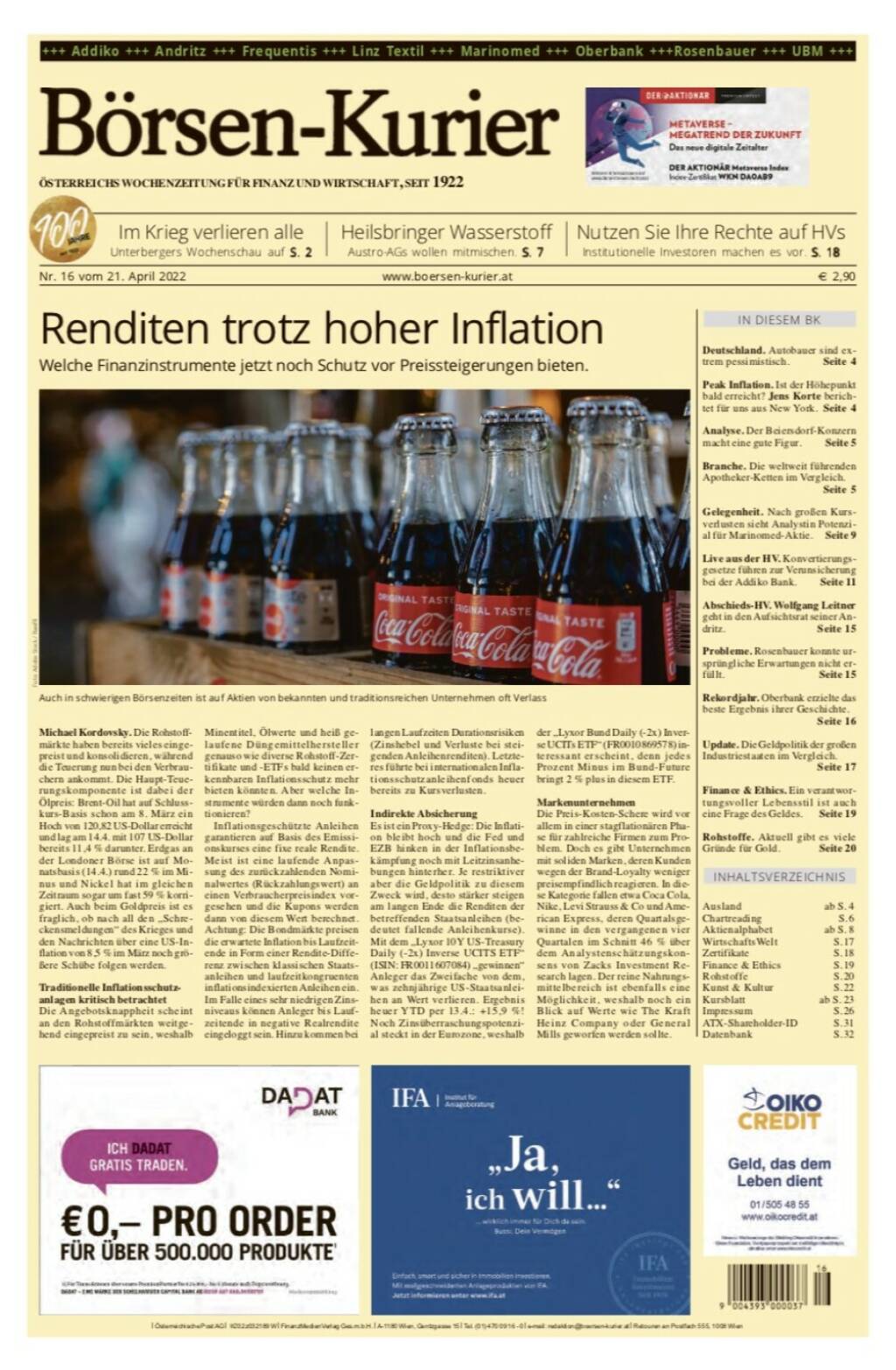 Und wieder ein Blick in den Börsen-Kurier Nr. 16 vom 21. April 2022, www.boersen-kurier.at