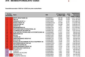 Die Wiener Börse hat die ATX (TR)-Beobachtungsliste 12 2023 veröffentlicht. Diese umfasst die Gesamtbörseumsätze 1 2023 bis 12 2023 der prime market-Werte. Sie hat 10 12 Bedeutung für die nächste Umstellung im März. Die Telekom hat zuletzt die Strabag ersetzt, dieser Platz ist auch nach Streubesitzfaktoren-Anpassung und ETS-Abspaltung ungefährdet. Die Strabag wird in den nächsten Monaten wohl Mayr-Melnhof challengen, VIG hat sich wieder etwas abgesetzt. » Weiterlesen