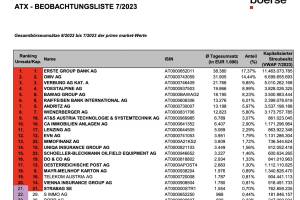 Die Wiener Börse hat gestern die ATX (TR)-Beobachtungsliste 07 2023 veröffentlicht. Diese umfasst die Gesamtbörseumsätze 08 2022 bis 07 2023 der prime market-Werte. Sie hat 11 12 Bedeutung für die nächste Umstellung im September. Der August 2022 wird noch durch August 2023 ersetzt. Anm.: Erstmals ist die Telekom Austria in dieser Phase nicht nur vor der Strabag, sondern auch vor der VIG. Im ATXFive fand zuletzt die grössere voestalpine gegen Andritz keinen Einzug in den Index. Diesmal ist die Konstellation ähnlich, voestalpine hat wieder alle Chancen, wieder knapp, aber es geht nicht nur um Andritz, sondern auch um Bawag. (Der Input von Christian Drastil für den http: www.boerse-social.com gabb vom 02.08.) » Weiterlesen