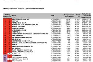 Die Wiener Börse hat die ATX (TR)-Beobachtungsliste 12 2022 veröffentlicht. Diese umfasst die Gesamtbörseumsätze 01 2022 bis 12 2022 der prime market-Werte. Sie hat 10 12 Bedeutung für die nächste Umstellung im März und ist die lupenreine Liste für 2022. ATX (TR): Das ATX Komitee hatte die S Immo durch die Strabag ersetzt, nach Liste wäre die S Immo per Ende Dezember noch drin. Challenger der Strabag ist nun die Telekom Austria, die ordentlich aufgeholt hat, allerdings ist der Rückstand für eine Aufnahme bei nächster Gelegenheit wohl noch zu gross. » Weiterlesen