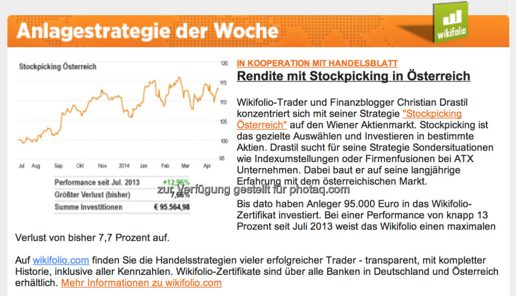 Bis dato haben Anleger 95.000 Euro in das Wikifolio-Zertifikat investiert. Bei einer Performance von knapp 13 Prozent seit Juli 2013 weist das Wikifolio einen maximalen Verlust von bisher 7,7 Prozent auf.