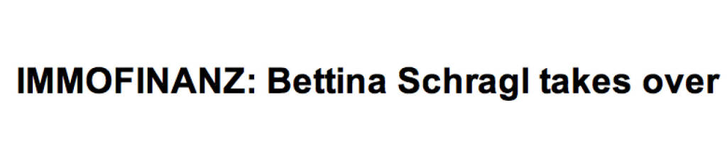 Manchmal reissen Texte im Mailer an lässigen Punkten ab. Heute kam eine Meldung rein, die bei mir die Ansicht: "IMMOFINANZ: Bettina Schragl takes over" auslöste. Hat meine langjährige und hochgeschätze Ex-Kollegin Bettina Schragl (wir arbeiteten beim WirtschaftsBlatt und waren beide GF beim Börse Express) etwa die Immofinanz übernommen? Nein, aber die IR-Agenden... alles Gute, Bettina!