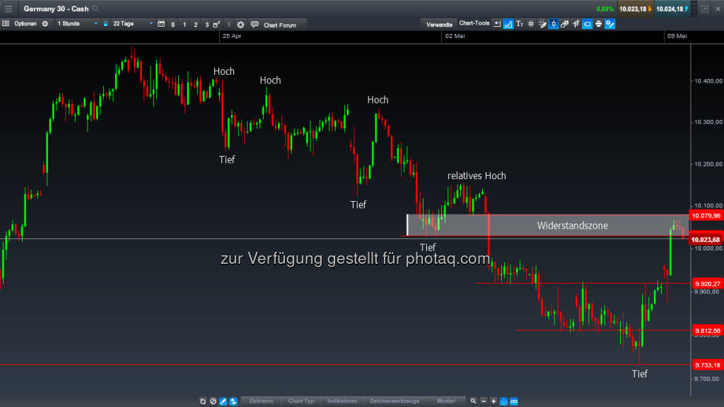 Laut Trendbestimmung nach Charles Dow (Wirtschaftswissenschaftler Ende des 19. Jahrhunderts) befindet sich das letzte relative Hoch im Stundenchart (1 Kerze = 1 Stunde) bei 10.155 Punkten. Solange dieses von unten nach oben nicht gebrochen wird, bleibt der DAX im 60-Minuten-Chart technisch gesehen auf der Short-Seite.