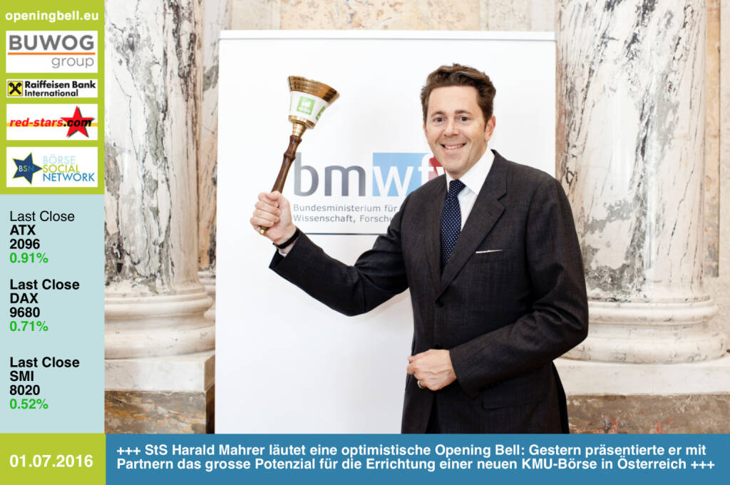 1.7: Staatssekretär Harald Mahrer läutet eine optimistische Opening Bell für das 2. Halbjahr: Gestern präsentierte er mit Partnern das grosse Potenzial für die Errichtung einer neuen KMU-Börse in Österreich. Bilder zum Event: http://www.photaq.com/page/index/2593 (c) Michèle Pauty