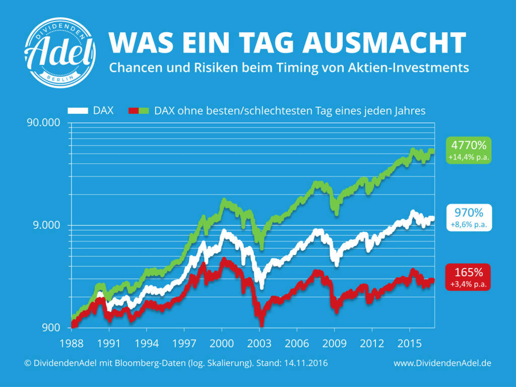 Wer versucht, das Schlechte zu vermeiden, läuft Gefahr, das Beste zu verpassen. Auch das lässt sich anhand der DAX-Historie nachvollziehen: Fehlt jedes Jahr nur der schlechteste Börsentag, stehen für die letzten 30 Jahre nur noch kümmerliche 165% Zuwachs zu Buche. Ein dergestalt kastrierter DAX notiert dann bloß noch bei 2.660 Punkten.
