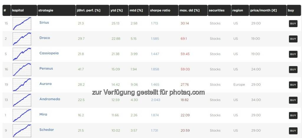Trader erhalten mit dem moomoc Aktien Screener, der ausschließlich über flexible, jederzeit stornierbare Monatsabos angeboten wird, die interessantesten Aktien Empfehlungen aus dem Dax, dem Dow Jones oder dem S&P 500. Das Angebot beschränkt sich somit ausschließlich auf Blue Chips und bietet dem Trader vollste Flexibilität. Die Preise beginnen bei 14 Euro im Monat und reichen bis 34 Euro – in Abhängigkeit von den Renditechancen der Strategien, von denen derzeit 20 im moomoc Anlageuniversum angeboten werden.