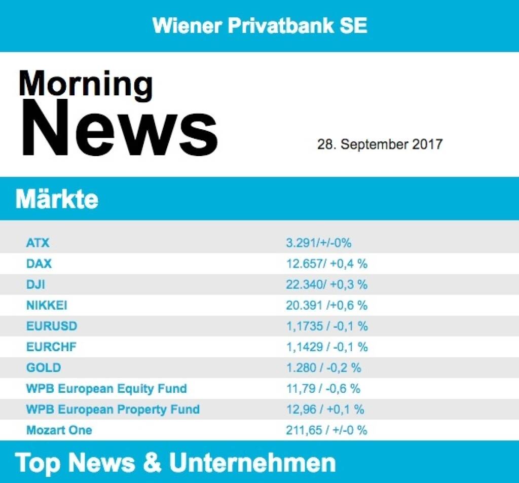 - Im Vorfeld der Präsentation der US-Steuerreform (Details siehe unten) konnten die Aktienmärkte gestern zulegen, die Renditen stiegen (gestern notierte die 10-jährige deutsche Bundesanleihe bei 0,45%) und der Dollar verfestigte sich. Hintergrund ist die gerechtfertige Erwartung, dass diese Steuerreform das US-Wirtschaftswachstum belebt. Unterstützung erhielten die europäische Börsen dabei von einem weiter nachgebenden Euro, der vor allem exportorientierte Werte stützte. Gut kam an, dass Siemens und Alstom ihre Bahnsparten fusionieren wollen. Siemens legten um 1,2 Prozent zu, Alstom gewannen 4,3 Prozent. Der europäische Bankensektor stieg um 2 Prozent und war der Tagesgewinner. Finanzwerte profitierten davon, dass Fed-Chefin Yellen vor zu langsamen Zinsschritten gewarnt hatte, der Zinserhöhungstrend also intakt zu sein scheint. Das schürte die Hoffnung auf steigende Renditen, die das Bankengeschäft profitabler machen. Der Index der Versicherer stieg um 1,2 Prozent. Der ATX schloss unverändert, gesucht waren Wienerberger (+3,0%), VIG (+2,9%) und Andritz (+1,8%).