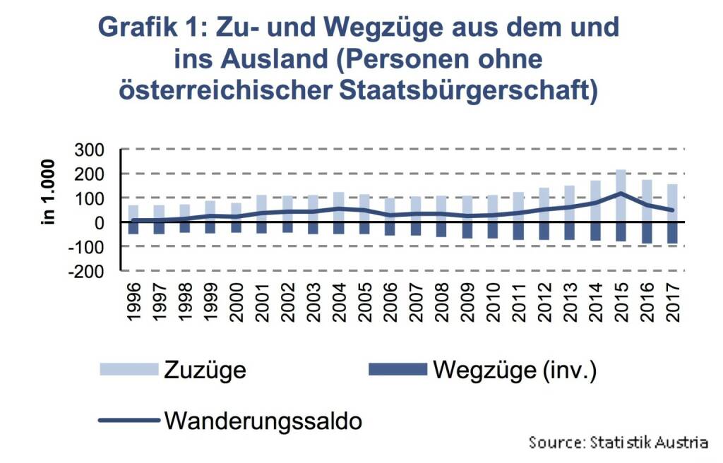 Im Jahr 2017 betrug die Netto-Zuwanderung nach Österreich, auch Wanderungssaldo genannt, 44.630 Personen. Wird die negative Netto-Zuwanderung jener Personen mit österreichischer Staatsbürgerschaft in der Höhe von 5.143 exkludiert, ergibt sich eine Netto-Zuwanderung jener Personen ohne österreichischer Staatbürgerschaft von 49.773 Personen. Dies entspricht 0.57 % der österreichischen Gesamtbevölkerung. Kumuliert über die letzten 10 Jahre (2008-17) steigt der Anteil auf 6.3 %.
