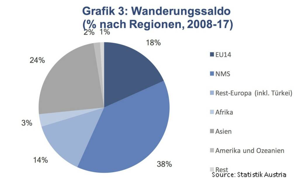 Demnach ist es wenig überraschend, dass die Länder der EU Osterweiterung (EU-Beitrittsstaaten ab 2004, NMS) mit 38.4 % den größten Anteil darstellen. Asien, worin auch die Staaten des Nahen Osten enthalten sind, hat mit 24 % den zweitgrößten Anteil am Wanderungssaldo. Die EU-Staaten vor 2004 (18.3 %) und Europa (13.6 %), exklusive EU und EFTA (Island, Liechtenstein, Norwegen und Schweiz) aber inklusive der Türkei, stellen weitere bedeutende Zuwanderungs- regionen dar (Grafik 3). In den letzten 10 Jahren war die größte Veränderung in den regionalen Anteilen nach Staatsangehörigkeit der Anstieg der neuen EU-Beitrittsstaaten. Dieser blieb mit Ausnahme der Jahre 2015 und 2016 stabil bei 66 %. Trugen die alten sowie die neuen EU-Staaten 2008 noch jeweils 33 % zum Wanderungssaldo bei, fiel der Anteil der alten EU-Staaten 2017 auf 18.5 % während der Anteil der neuen EU-Staaten auf 48 % anstieg.