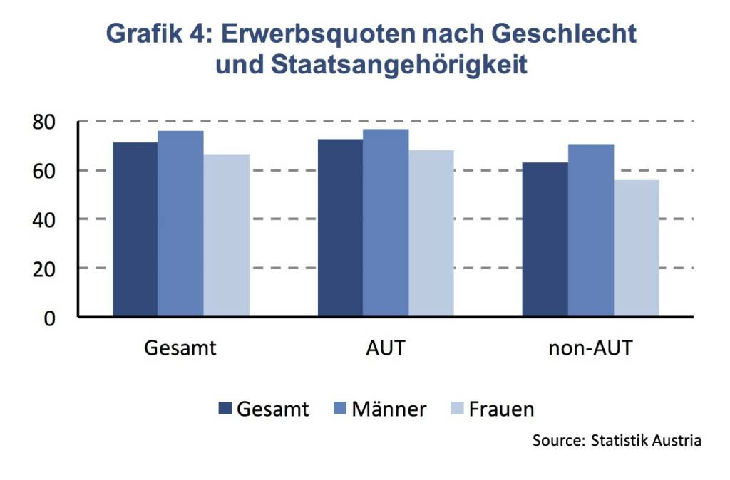 Migration hat viele ökonomische Facetten. Die Struktur der Netto-Zuwanderung nach Staatsangehörigkeit wurde bereits dargestellt, nun stellt sich die Frage wie gut Migranten in den österreichischen Arbeitsmarkt integriert sind. Grafik 4 stellt die Erwerbsquoten für die Altersgruppe 15 bis 64 Jahre nach Staatsangehörigkeit und Geschlecht dar. Im Zeitraum 2008 bis 2017 waren durchschnittlich 71,2 % der österreichischen Gesamtbevölkerung im Alter zwischen 15 und 64 Jahren erwerbstätig. Die Erwerbsquote der österreichischen Bevölkerung ohne österreichischer Staatsbürgerschaft ist mit 63,1 % deutlich geringer und die Erwerbsquote der Bevölkerung mit österreichischer Staatsbürgerschaft dementsprechend höher (72,5 %). Die niedrigste Erwerbstätigkeit zeigen Frauen ohne österreichische Staatsbürgerschaft (56,0 %), wenn auch betont werden muss, dass die Erwerbsquote von Frauen mit österreichischer Staatsbürgerschaft (68,2 %) auch deutlich unter jener von Männern (76,7 %) liegt. Die niedrigere Erwerbstätigkeit von Migranten kann demnach sowohl durch eine niedrigere Erwerbsquote bei Männern und, noch deutlicher, bei Frauen erklärt werden. Partizipationsraten, zeigen ein ähnliches Bild weisen jedoch geringere Unterschiede nach Staatsangehörigkeit auf, da Personen ohne österreichische Staatsbürgerschaft deutlich höhere Arbeitslosenraten aufweisen. 2017 betrug die Arbeitslosenrate von Personen ohne österreichische Staatsbürgerschaft 7,9 % und jene von Personen mit österreichischer Staatsbürgerschaft 3,5 %.