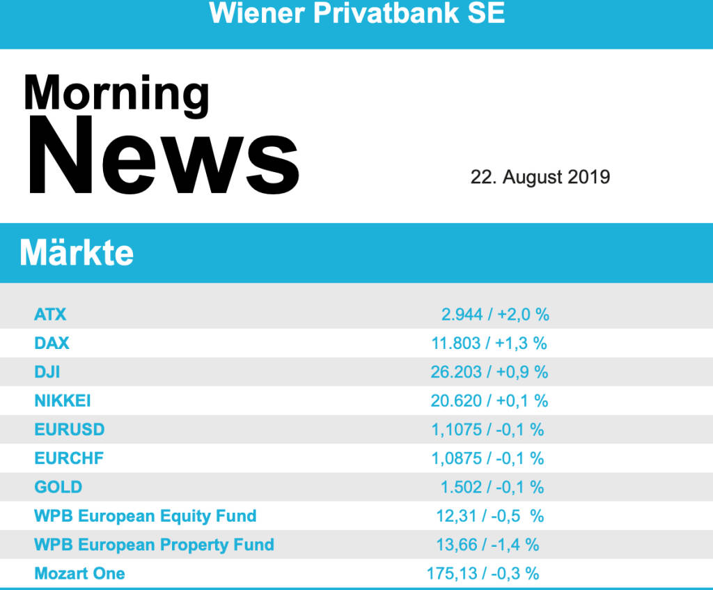 Vorbörslich sind die Märkte heute Donnerstag in Europa leicht schwächer zum Vortag indiziert. Die asiatischen Börsen tendieren uneinheitlich. Makroökonomisch stehen heute in Europa die Produzentenpreise, das Verbrauchervertrauen sowie das EZB Sitzungsprotokoll vom 25.7.2019 im Fokus der Märkte. In den USA erwarten wir heute die Erstanträge Arbeitslosenhilfe, PMI verarbeitendes Gewerbe und Dienste sowie die Frühindikatoren. Unternehmensseitig präsentierte gestern (nachbörslich) CA-Immo Geschäftszahlen. Heute erwarten wir die Unternehmensergebnisse von EVN und Schöller Bleckmann (siehe unten).