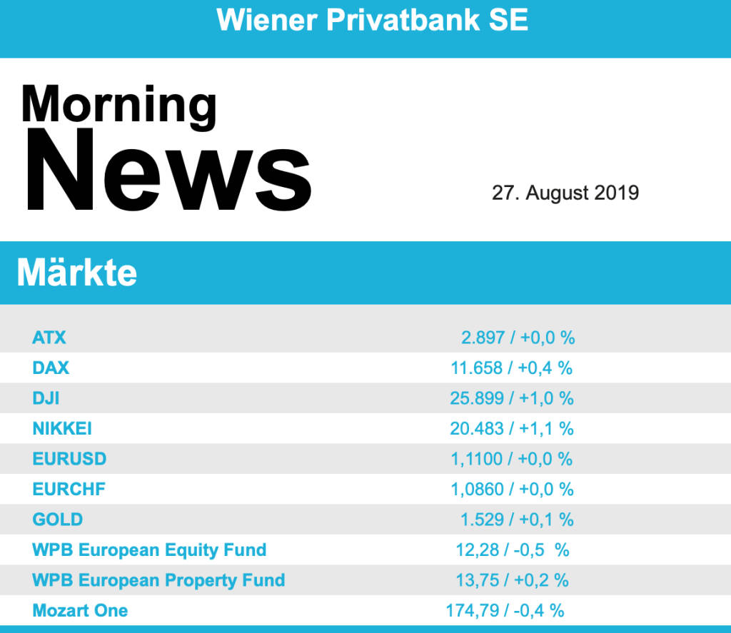 Vorbörslich sind die Märkte heute Dienstag in Europa nahezu unverändert indiziert. Die asiatischen Börsen beenden den heutigen Handelstag mit Gewinnen. Makroökonomisch stehen heute in Europa das BIP Q2 in Deutschland sowie das Verbrauchervertrauen und Geschäftsklima in Frankreich im Fokus der Märkte. In den USA erwarten wir ebenso die Veröffentlichung der Daten zum Verbrauchervertrauen für August 2019. Unternehmensseitig erwarten wir heute Geschäftszahlen von S-Immo, Vienna Insurance Group (VIG ) und Warimpex (siehe unten).