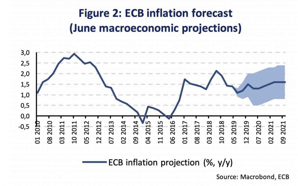 The detailed results from Eser et al. (2019) are useful for quantifying the effects of additional rounds of asset purchases. The June macroeconomic projections of the ECB staff forecast real GDP growth of 1.2 % in 2019 and 1.4 % in 2020 and 2021. Inflation was projected at 1.3 %, 1.4 % and 1.6 for 2019-2021. Furthermore, the ECB staff provides ranges around the central projections for GDP and inflation. Figure 2 shows the central inflation projections as well as lower and upper bounds.