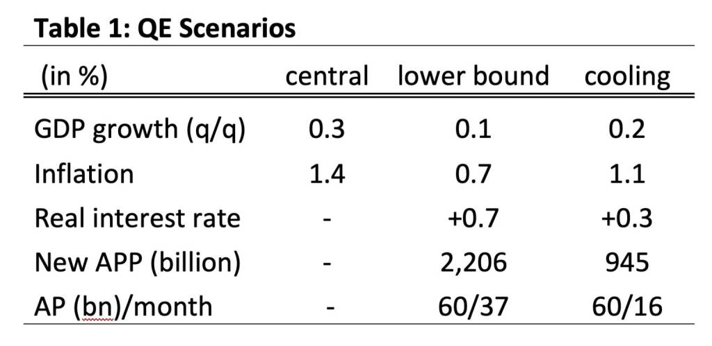 At the lower bound, year-over-year inflation would fall to 0.7 % on average (from 1.4 % in the central scenario) between H2 2019 and 2021. Accordingly, the lower bound for GDP growth implies average quarterly growth of 0.1 % (q/q); compared to 0.3 % in the central scenario. We assume that the lower bound represents a realistic downside risk scenario. Quarterly GDP growth slowed to 0.2 % in Q2 2019 and our real-time estimate for Q3 currently signals a further slowdown to 0.1 %. The inflation rate would fall short by 0.7 %-age points on average until 2021 (vis-à-vis the central projection), in turn, increasing the real Euro Area interest rates (adjusted for expected inflation) by an equivalent size. We can now make use of the above estimates for QE term premium effects to sketch monetary policy options. The 5-year and 10-year term premia decreased by 27 and 37 basis points (on average 32 basis points) per each trillion of asset purchases. To keep the real interest rate at the level of the central projection, in turn, a reduction by 70 basis points of the term premium would be required. Hence, it would imply additional asset purchases amounting to 2.2 trillion. Table 1 summarizes the arithmetic and adds an additional scenario (“cooling”) for which we assume a growth slowdown half as severe as the lower bound scenario.
