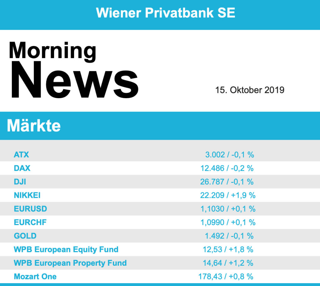Vorbörslich sind die Märkte in Europa heute Dienstag leicht freundlicher indiziert. Die Börsen in Asien beenden den heutigen Handelstag uneinheitlich. Auf Unternehmensseite präsentiert FACC den Halbjahresbericht 2019/2020, Kapsch TrafficCom kappt die Prognose nach deutschem Mautdebakel (siehe unten), heute nachbörslich erwarten wir die Geschäftszahlen von Telekom Austria für das 3. Quartal 2019. Makroseitig stehen in Europa heute die Verbraucherpreise (FRA), Arbeitslosenzahlen (GBR) sowie der ZEW Konjunkturindikator in Deutschland, in den USA der Empire State Index für Oktober 2019 im Fokus der Märkte.