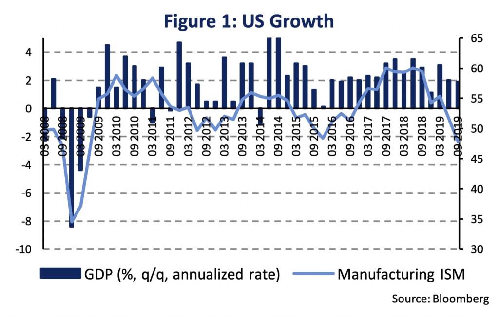 In addition to the one-sided GDP growth, weak spots of the business cycle can be observed. Weak industry prospects – industrial production fell slightly in September (-0.1 % y/y) – were confirmed by the ISM manufacturing survey in October. The index keeps indicating a contraction in US manufacturing, though it stabilized (48.3 after 47.8). Furthermore, job growth has slowed steadily since the beginning of the year. In October, 128.000 new jobs were (non-farm payrolls) created after 180.000 in the preceding month. The jobs figure was better than expected but is in line with weaker business momentum.