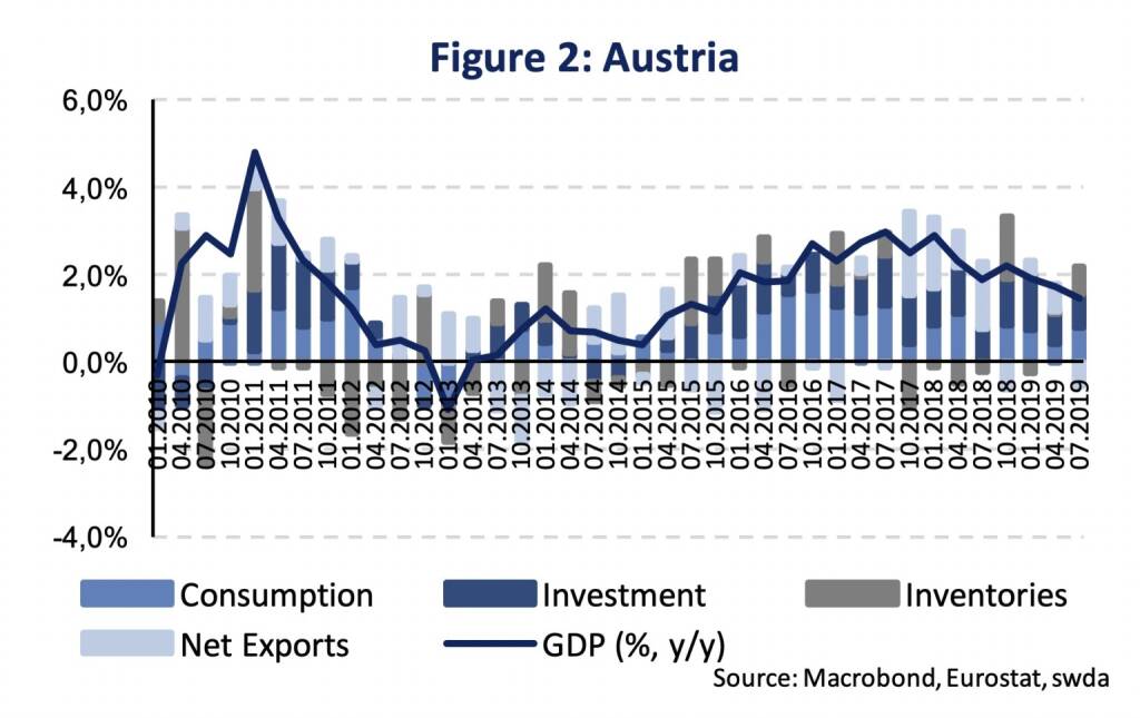 The cooling of the Austrian economy continued. Austria’s GDP growth was 0.2 % (q/q, Wifo trend-business cycle) and 1.5 % annually (Figure 2).