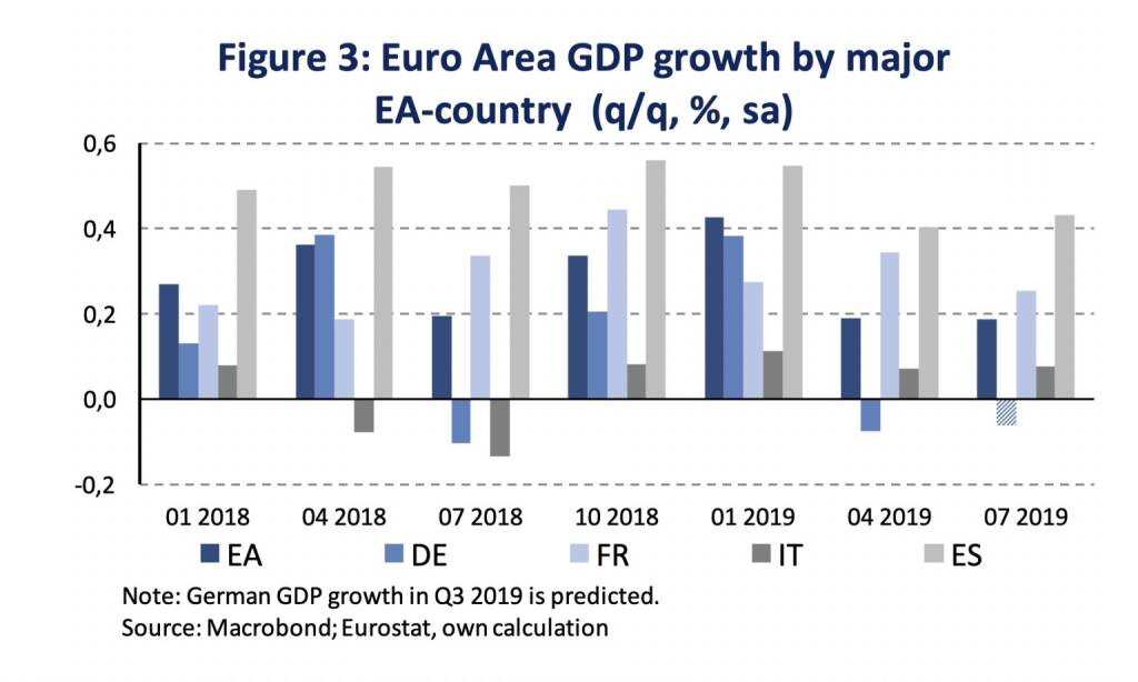 According to the first release, the Euro Area real GDP rose by 0.2 % (q/q) in Q3 after 0.3 % during H1 2019. In annual terms, GDP enhanced by 1.2 % in Q3 after 1.9 % during the total of 2018. The outcome came as a surprise to us as our nowcasting model signaled zero growth, hence, it must be watched how revisions come out.