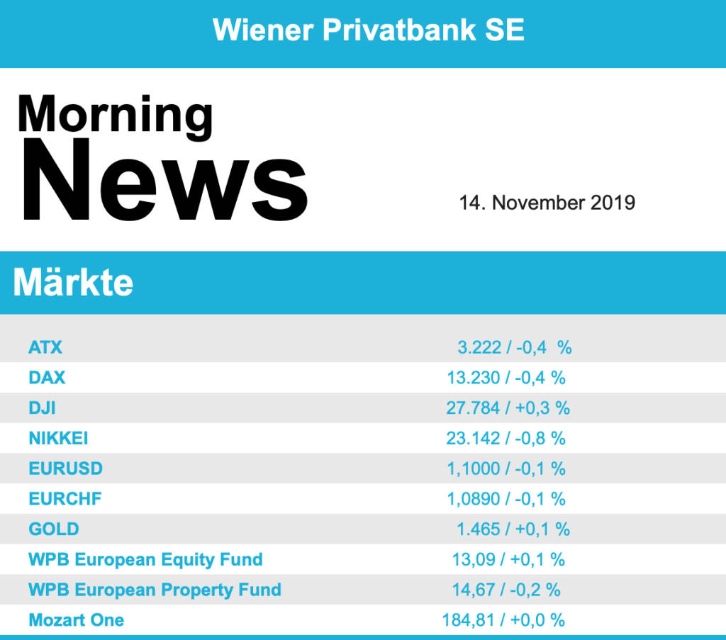 Vorbörslich sind die Märkte in Europa heute Donnerstag zur Eröffnung wenig verändert bis leicht schwächer indiziert. In Asien beenden die Börsen den heutigen Handelstag uneinheitlich mit mehrheitlich leichterer Tendenz. Unternehmensseitig gibt es heute Geschäftszahlen von DO & CO (im Laufe des Tages), Flughafen Wien , Mayr Melnhof, Post und RBI (siehe unten). Makroökonomisch erwarten wir in Europa heute die Arbeitslosenquote und Verbraucherpreise (FRA), das BIP Q3/19 (DEU und EUR), sowie den Einzelhandelsumsatz (GBR), in den USA Erzeugerpreise sowie die Erstanträge Arbeitslosenhilfe (Woche).