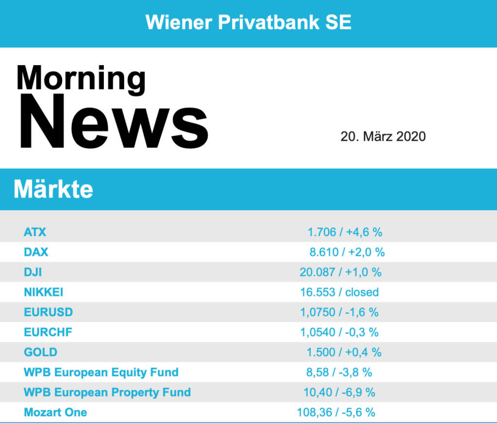 Vorerst einmal gestoppt werden konnte gestern die Abwärtsbewegung an den Märkten in Europa dank des Unterstützungsprogrammes durch die EZB. Diese hatte in der Nacht auf Donnerstag ein Notkaufprogramm für Anleihen im Umfang von 750 Milliarden Euro angekündigt. Die Maßnahmen sollen dazu beitragen, dass es auf den Finanzmärkten infolge der Coronakrise nicht zu weiteren Verwerfungen kommt. So konnte der EuroStoxx 50 mit einem Plus von 2,9% den Handel beenden, in Frankreich ging es 2,7% nach oben, der Dax erzielte ein Plus von 2,0% und der Markt in London endete 1,8% stäker, hatte aber in den vergangenen Tagen nicht in gleichem Ausmaß wie die anderen Börsen abgeben müssen.