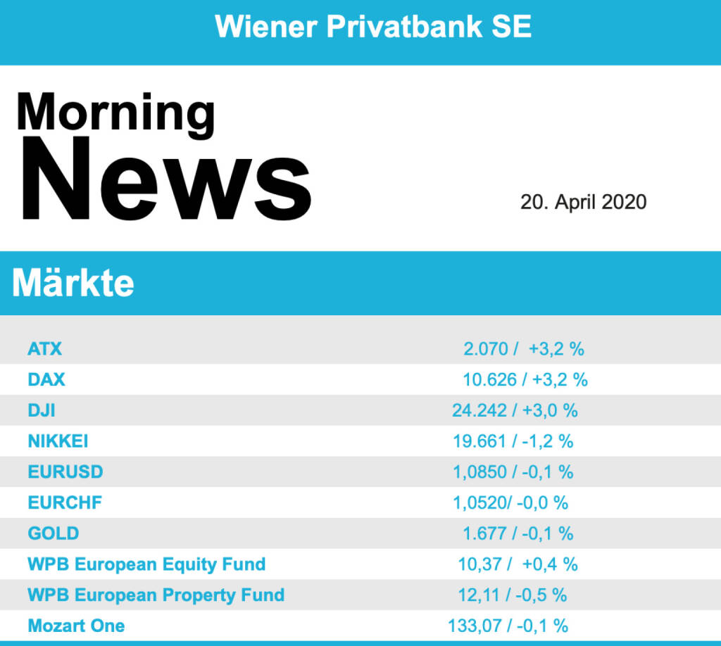 Vorbörslich sind die Märkte in Europa heute Montag zu Wochenbeginn zur Eröffnung freundlich indiziert. Die Börsen in Asien präsentierten sich uneinheitlich, Chinas Börsen mit Kurszuwächsen, Japan mit Verlusten. Unternehmensseitig gibt es Neuigkeiten zu Flughafen Wien (siehe unten). Makroseitig stehen in Europa heute die Erzeugerpreise (DEU), die Leistungsbilanz (ITA & EUR) sowie die Handelsbilanz (EUR), in den USA der CFNA-Index für März 2020 im Fokus der Märkte.