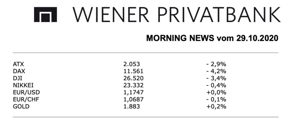 Auch der heimische Markt konnte sich der allgemeinen Risikoreduktion nicht entziehen, für den ATX brachte der Handel einen Rückgang von 2,9%. Gesucht war gestern Andritz nach vorläufigen Drittquartalszahlen, der Anlagenbauer konnte für das dritte Quartal einen Gewinn von 50 Millionen Euro vermelden, nach einem Verlust von 35 Millionen Euro im Vorjahresquartal, was deutlich über den Markterwartungen lag und in einem Anstieg des Titels um 2,1% resultierte. Lenzing, am Vortag noch mit deutlichen Zuwächsen, konnte den Aufschwung nicht halten, der Faserhersteller ging 5,3% leichter aus dem Handel. Die Banken wurden ebenfalls abverkauft, die Bawag hielt sich nach dem deutlichen Rückgang des Vortages noch vergleichsweise gut und musste lediglich 0,8% nachgeben, die Erste Group rutschte schon deutlicher um 3,1% ab, die Raiffeisen ging mit einer 3,9% tieferen Schlussnotierung aus dem Handel. Neben Andritz konnte sich auch Do & Co verbessern, das Cateringunternehmen wurde nach den starken Abgaben des Vortages wieder gekauft und konnte um 0,6% vorrücken. Die Telekom Austria profitierte in dem risikoaversen Umfeld von der Suche nach defensiven Titeln und erzielte ein Plus von 0,5%, auch Schoeller-Bleckmann war nach den starken Verkäufen gefragt und konnte sich leicht um 0,3% verbessern. Semperit konnte weiter der allgemeinen Stimmung trotzen, der Gummihersteller ging unverändert aus dem Handel, genau so erging es dem Kranhersteller Palfinger und dem Flugzeugzulieferer FACC, auch hier war der Schlusskurs unverändert zu dem vom Vortag. Deutlichster Verlierer war der Flughafen Wien, hier äußerte sich die starke Betroffenheit von weiteren Lockdownmaßnahmen in einem Minus von 8,0%, auch Zumtobel wurde verkauft, für den Leuchtenhersteller brachte der Handel einen Rückgang von 7,9%.