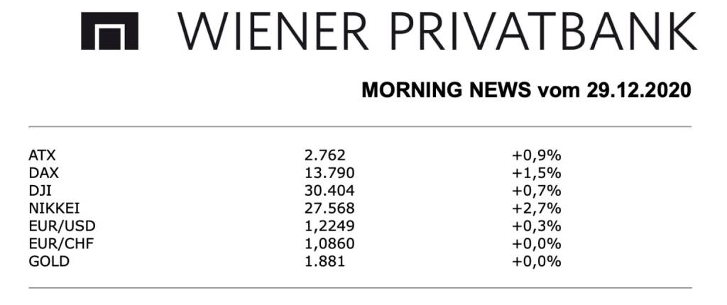 Der heimische Aktienmarkt schloss gestern mit Kursgewinnen. Schon zu Beginn startete der ATX höher in den Handel und konnte den Gewinn im Laufe des Tages immer weiter ausbauen und verbuchte am Ende des Tages einen Gewinn von 0,9% bzw. 2.761,71 Punkte. Die Meldungen seitens der Unternehmen waren kaum vorhanden. Unterstützung kam weiterhin von der Einigung zwischen Großbritannien und der EU bezüglich des Brexit Handelspaktes und dem 900 Milliarden USD schweren Konjunkturpaket in den USA. Der Gewinner des Tages war nach den vorgestrigen Verlusten der Funkausrüster Frequentis und schloss mit einem Gewinn von 12%, auch die AT&S konnte ein Plus von 8,5% verbuchen. Die Verlierer des Tages waren Polytec mit minus 1,3% und die kleine Addiko Bank mit 0,7% Abschlag. Bei den übrigen Banken gab es gestern nur Gewinner, allen voran die BAWAG mit plus 0,8%, gefolgt von der Erste Group mit 0,4% höher und der RBI mit einem kleinen 0,1% Aufschlag.