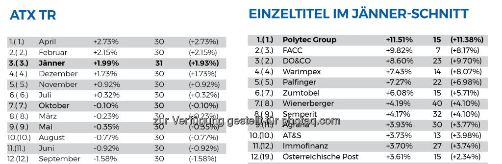 In der Jänner-Einzelaktiensicht aller aktuellen ATXPrime-Titel ist nun Polytec vorne, dies mit durchschnittlich +11,51% in 15 Jahren Börsenotiz. Auch FACC mit +9,82% (7 Jahre) und Do&Co mit +8,60 Prozent (23 Jahre) sind extreme Jänner-Kings., Do&Co ist damit die Nr. 1 im ATX TR. Auf Rang 1 im ATXFive ist Wienerberger mit 4,19%.
