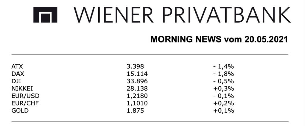 Für den heimischen Markt ging es gestern nach unten, das Minus von 1,4% für den ATX war im Rahmen der gesamteuropäischen Entwicklung. Vor allem im Späthandel wurden die Abschläge im Zuge der schwächeren Eröffnung an der Wall Street noch einmal ausgeweitet. Im Blickpunkt des Geschehens standen am gestrigen Handelstag Ergebnisvorlagen einiger heimischer Unternehmen. Semperit berichtete einen Umsatzsprung in der Medizinsparte von 148,9 Prozent, durch die Erholung in der Industrie konnte dadurch ein Gewinn in Millionenhöhe erzielt werden, allgemein übertraf das Ergebnis die Erwartungen, nach Kursgewinnen im Frühhandel musste die Aktie dann aber nachgeben und endete mit einem Minus von 3,2%. Auch die Ergebnisse von Schoeller-Bleckmann wurden eher negativ aufgenommen, der Ölfeldausrüster hat im ersten Quartal 2021 einen Umsatz- und Gewinneinbruch im Vergleich zum Vorjahr erlitten, der Umsatz sank von 108,9 Millionen Euro vor einem Jahr auf nun 59,3 Millionen Euro, der Nettogewinn schmolz von 8,6 Millionen auf 1,0 Millionen Euro zusammen, der Titel endete mit einem Rückgang von 3,0%. Vienna Insurance Group konnte das Nettoergebnis im ersten Quartal um rund 15 Prozent auf 99 Millionen Euro erhöhen, das Gesamtprämienvolumen war in den ersten drei Monaten stabil bei 3,11 Milliarden Euro, für den Versicherungskonzern gab es trotzdem einen Abschlag von 1,0%. Die Deutsche Bank revidierte das Kursziel für Mayr-Melnhof nach der Zahlenvorlage am Vortag von 190,0 Euro auf 175,0 Euro nach unten und beliess die Einstufung als „Hold“ unverändert, für den Kartonhersteller ging es gestern um 1,6% nach unten. S Immo endete mit einem Abschlag von 0,5%, der Immobilienkonzern zeigt sich mit dem Übernahmeangebot seines Großaktionärs Immofinanz in einer ersten Reaktion nicht zufrieden, der Angebotspreis in Höhe von 22,25 Euro je Aktie berücksichtige nicht die Wertsteigerung der Immobilien hiess es von Seiten des Unternehmens, Immofinanz musste 1,1% nachgeben. Bei den Banken gab es ein unterschiedliches Ergebnis, die Erste Group konnte sich weiter gut halten und 0,1% zulegen, die Raiffeisen schloss 1,8% schwächer, die Bawag musste einen Rückgang von 2,6% hinnehmen, die kleinere Addiko Bank konnte prozentuell unverändert schliessen. Die Gewinner des Tages waren Warimpex und Frequentis, die um 0,9% beziehungsweise um 0,8% vorrücken konnten, auch Kapsch TrafficCom hatte einen relativ guten Tag und schaffte eine Verbesserung von 0,6%.