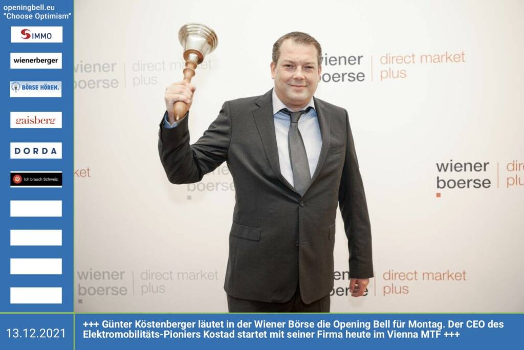 13.12.: Günter Köstenberger läutet in der Wiener Börse die Opening Bell für Montag. Der CEO des Elektromobilitäts-Pioniers Kostad startet mit seiner Firma heute im Vienna MTF. https://www.kostad.at https://www.wienerborse.at/marktdaten/aktien-sonstige/preisdaten-direct/?ISIN=ATKOSTADAG01&ID_NOTATION=360919641&cHash=b866397413299a5d1d08881869d0b85e