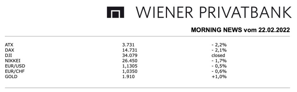 Aus den Morning News der Wiener Privatbank: Der allgemeinen negativen Stimmung in Europa konnte sich auch der heimische Markt nicht entziehen, für den ATX endete der Handel mit einem Rückgang von 2,2%. Auch in Wien belastete der Ukraine-Konflikt die Stimmung, die Hoffnung auf ein Gipfeltreffen hielt nicht lange, da die Nachrichtenlage diesbezüglich verworren blieb. Zusätzlich hatte auch der Kreml die Erwartungen an ein Treffen von Biden und Putin wieder gedämpft und die US-Regierung warnte weiter eindringlich vor einem russischen Einmarsch in die Ukraine. Weiteres Thema am Markt bleibt die Zinspolitik, so sprechen sich wohl immer mehr Mitglieder der EZB für eine Leitzinserhöhung in diesem Jahr aus, Medien spekulierten, dass das allgemeine Kaufprogramm APP im September auslaufen könnte, was eine erste Zinserhöhung im Dezember zur Folge haben könnte. Bei den einzelnen Unternehmen gab es kaum signifikante Neuigkeiten, lediglich Analystenstimmen sorgten für Aufmerksamkeit. Die Erste Group hob das Kursziel für Wienerberger von 35,0 Euro auf 37,0 Euro an und bestätigte die Einstufung als „Accumulate“, der Ziegelhersteller konnte sich um 0,2% etwas nach oben bewegen. Für Andritz erhöhte die Erste Group das Kursziel leicht von 60,0 Euro auf 61,0 Euro nach oben, die Kaufempfehlung wurde auch hier bestätigt, der Anlagenbauer musste dennoch relativ deutlich um 2,3% nachgeben.
