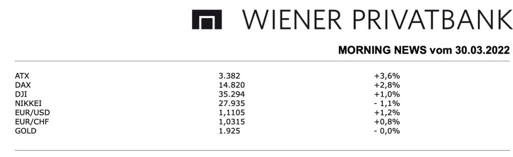 Aus den Morning News der Wiener Privatbank: Einen sehr guten Tag hatte auch der heimische Markt, der mit deutlichen Kursgewinnen schliessen konnte, für den ATX gab es eine Verbesserung von 3,6%. Auch in Wien halfen die deutlichen Entspannungssignale im Ukraine-Krieg, vor allem die schwergewichteten Bankentitel mit ihrer starken Ausrichtung nach Osteuropa waren die großen Gewinner. Die Raiffeisen Bank International konnte um 8,9% nach oben springen und war damit stärkster Titel des gestrigen Handels, auch die Erste Group präsentierte sich deutlich verbessert und konnte mit einer 5,1% höheren Notierung aus dem Handel gehen. Einen schönen Zuwachs gab es auch für die Bawag, die ein Plus von 3,9% erzielen konnte, lediglich die kleinere Addiko Bank konnte hier nicht ganz mithalten und musste sich mit einem Anstieg von 0,8% zufrieden geben. Unternehmensnachrichten waren aber gestern wieder einmal Mangelware, lediglich von Pierer Mobility gab es frische Zahlen, der Motorradhersteller hat den Nettogewinn im Jahr 2021 gegenüber dem Jahr zuvor auf 142,9 Millionen Euro nahezu verdoppelt, für das laufende Geschäftsjahr wird aber weiter mit Lieferengpässen gerechnet. Das Unternehmen sieht sich durch den Ukraine-Krieg nicht betroffen, die Gefahr steigender Rohstoff- und Energiekosten ist aber genauso wie bei anderen Industriewerten vorhanden, der Titel konnte um 0,8% zulegen.